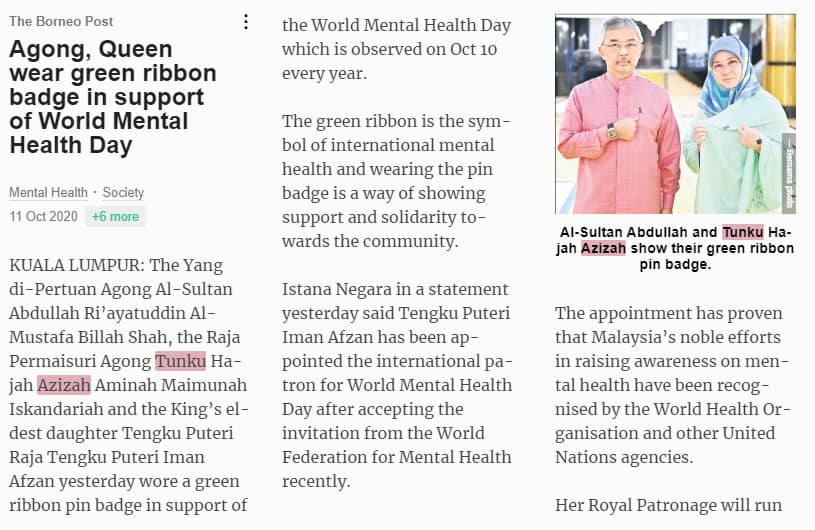 Agong, Queen Wear Green Ribbon Badge in Support of World Mental Health Day.