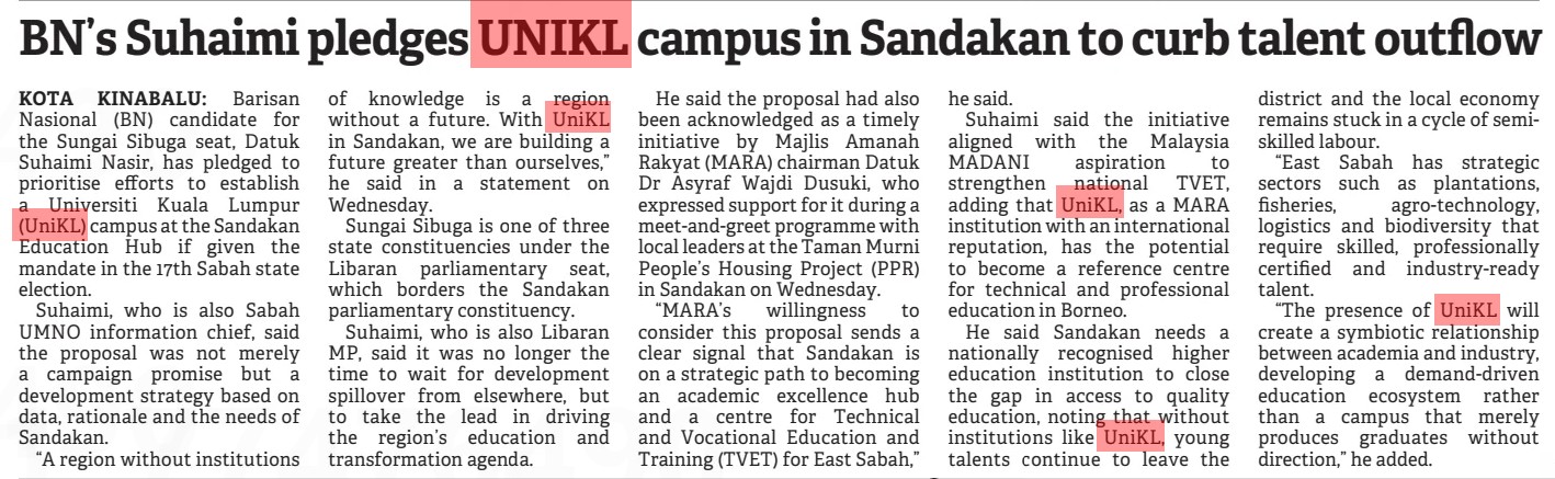 BN's Suhaimi pledges UNIKL campus in Sandakan to curb talent outflow