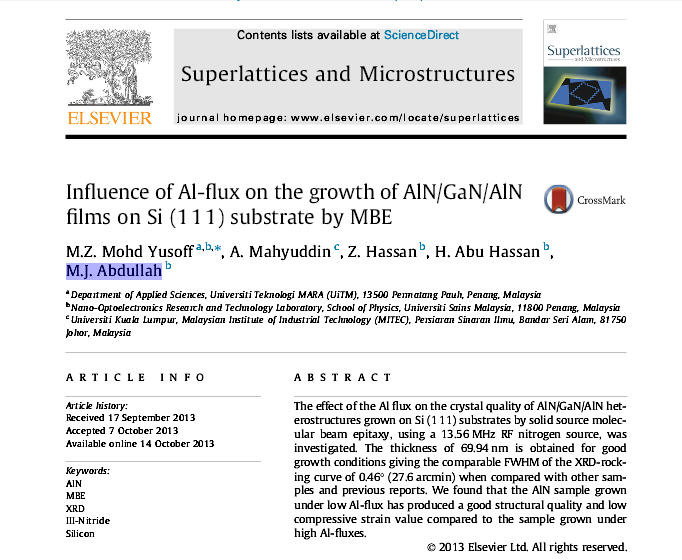 The effect of the Al flux on the crystal quality of AlN/GaN/AlN heterostructures grown on Si (1 1 1) substrates by solid source molecular beam epitaxy, using a 13.56 MHz RF nitrogen source, was investigated. The thickness of 69.94 nm is obtained for good growth conditions giving the comparable FWHM of the XRD-rocking curve of 0.46° (27.6 arcmin) when compared with other samples and previous reports. We found that the AlN sample grown under low Al-flux has produced a good structural quality and low compressive strain value compared to the sample grown under high Al-fluxes.