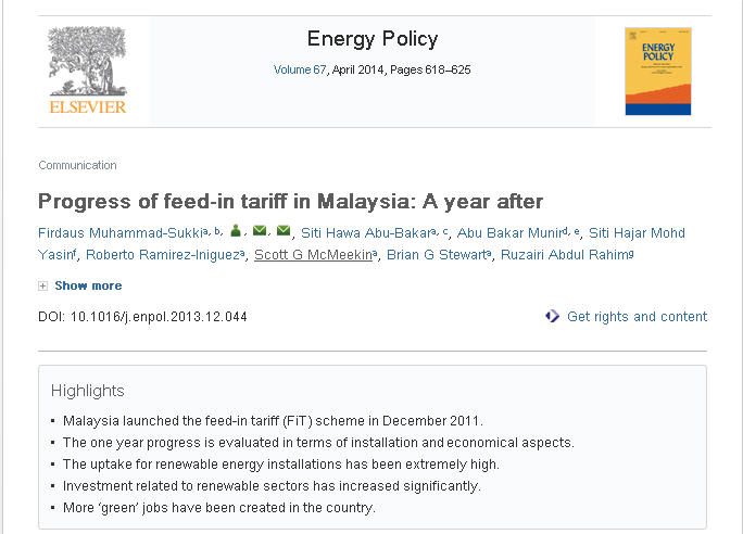Malaysia enacted the Renewable Energy Act in April 2011. One of its important components is the feed-in tariff (FiT) scheme—launched in December 2011. The scheme is managed and administered by the Sustainable Energy Development Authority (SEDA) of Malaysia. This paper analyses the impact of the FiT mechanism in Malaysia a year after its implementation; particularly on the installation and economical aspects. First, the history of the scheme is presented before summarising the application process for the scheme. Next, a detailed evaluation on the implication of the scheme is discussed. Some of the key findings from the analysis include: (i) the uptake for renewable energy installations has been extremely high, particularly for solar photovoltaic installation; (ii) the foreign and domestic direct investment related to renewable sectors have increased significantly; (iii) more ‘green’ jobs have been created, particularly in the manufacturing and installation sectors, and (iv) there are plans to include wind and thermal energy in the FiT scheme. It can be concluded that the FiT scheme in Malaysia has produced significant impact during the first year of its implementation. With a proper monitoring by SEDA and more awareness among the people, renewable energy will most likely flourish in Malaysia